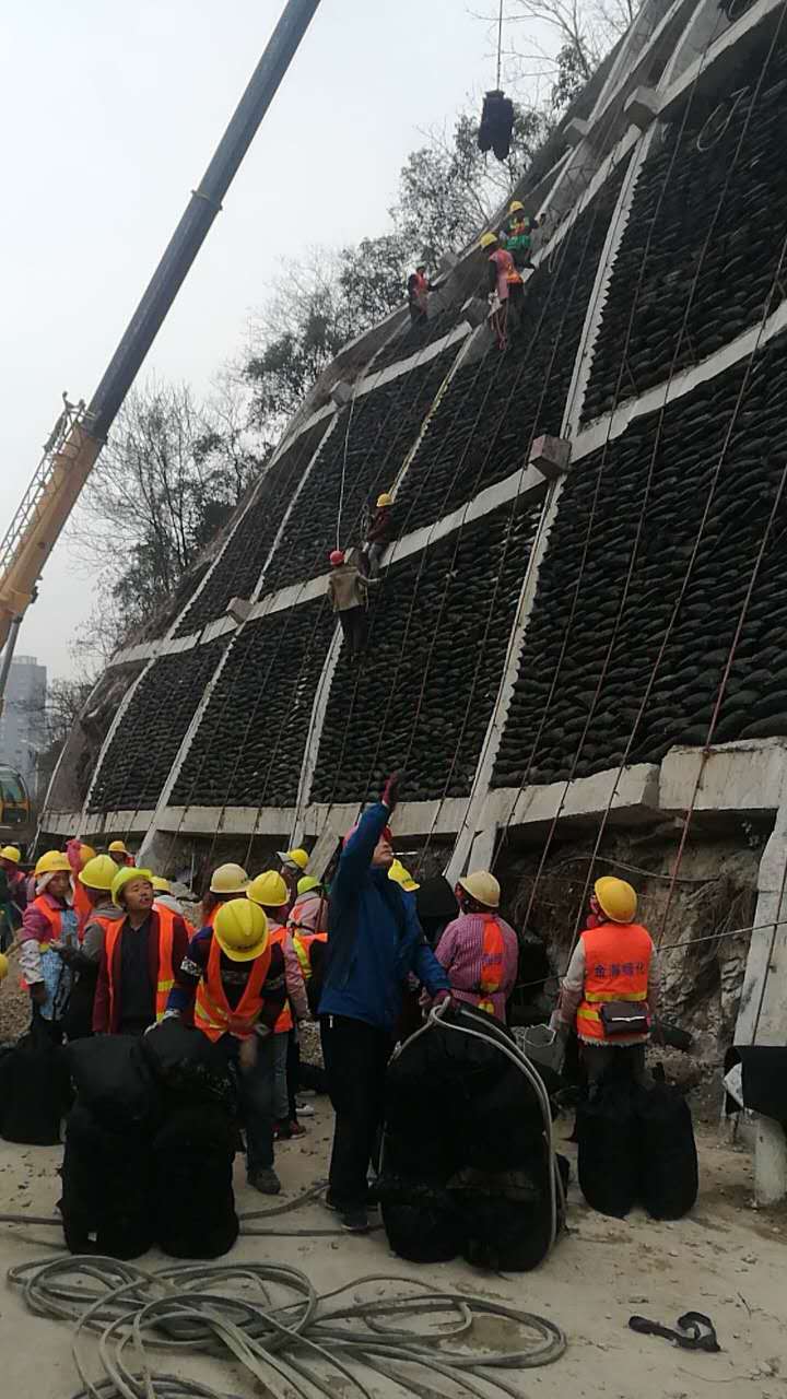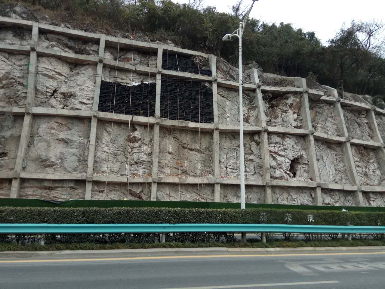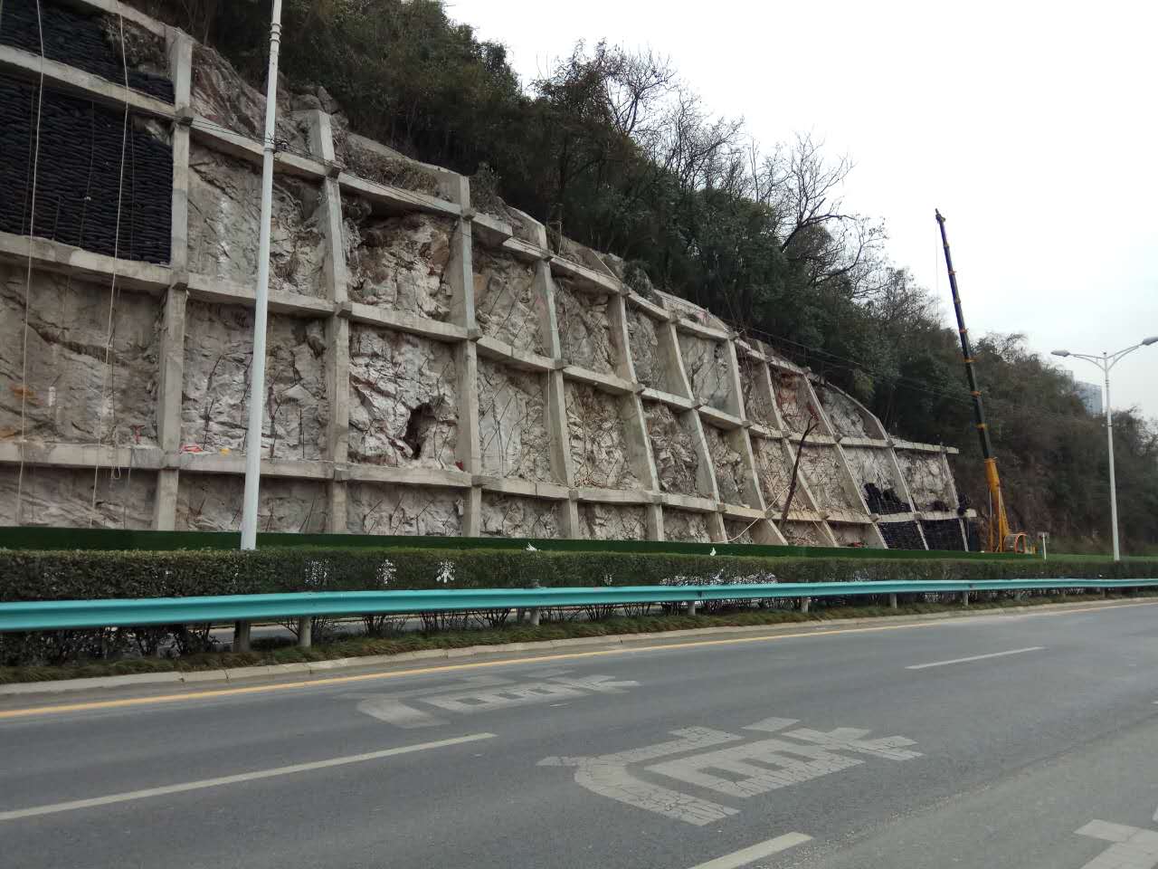 1、修复技术:经我公司有关部门商议;决定采用钢筋混凝土框架护坡技术与植生袋植草护坡技术相结合来进行该边坡的稳固与生态修复。钢筋混凝土框架护坡技术解决了因边坡坡度陡峭和车流量大造成的边坡稳定问题;植生袋植草护坡技术在解决边坡稳定的同时有成功为植物提供了优良的生长条件,能适应不同植物的生长要求,也为植物后期养护做好了准备。